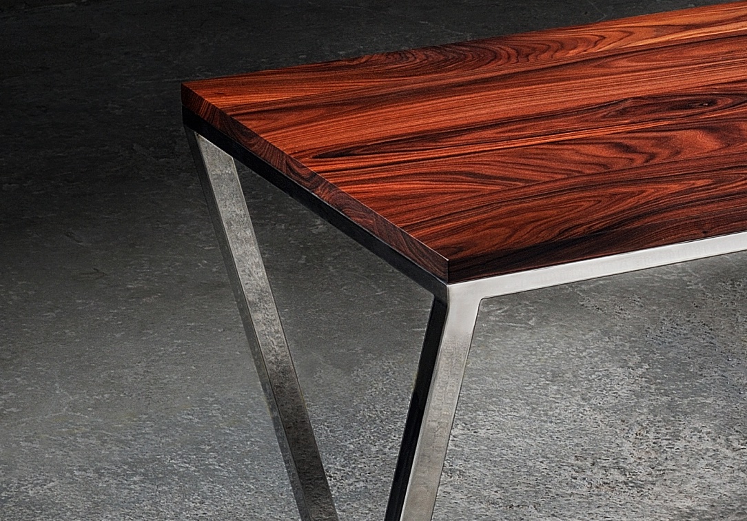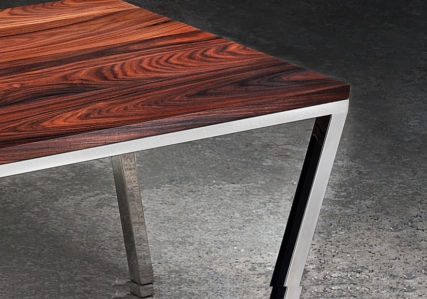 The table is made of natural materials. Solid Rosewood Santos top, origin South America, table structure stainless steel with “Gloss” surface finish. Possibility of making the table according to the requirements of the ordering person, also the choice of wood species, in the samples below.